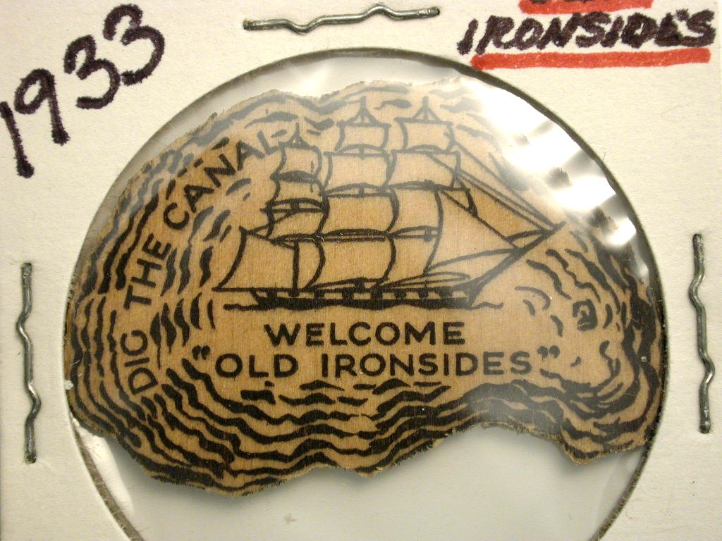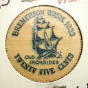 Samples of 1933 wooden money from Bremerton, WA featuring "Old Ironsides."