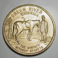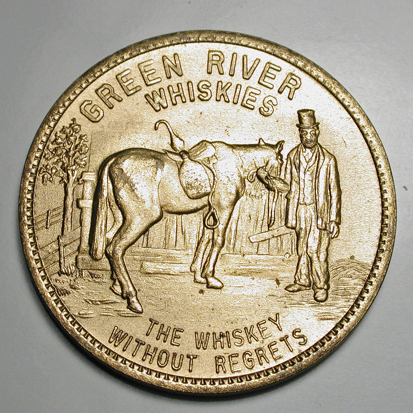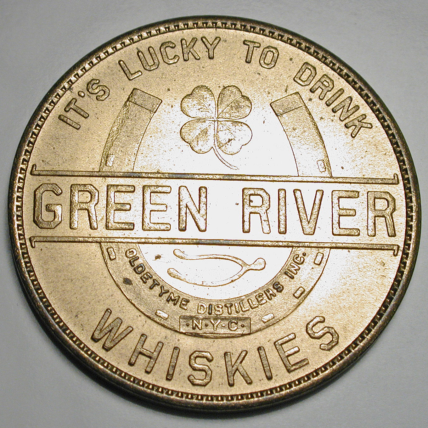 Left: The National Bicentennial Medal. Center/Right: Green River Whiskies lucky medallion.