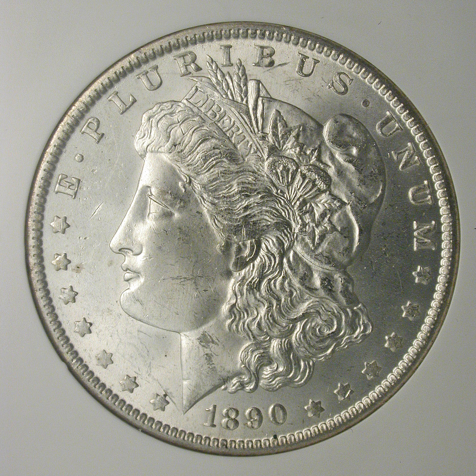Left: 1890-O Morgan Dollar, PCI MS-64.