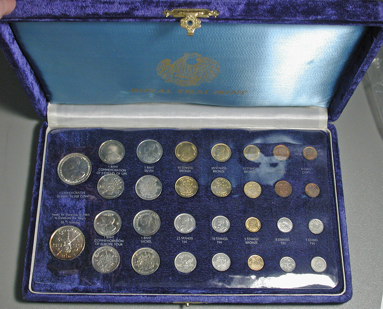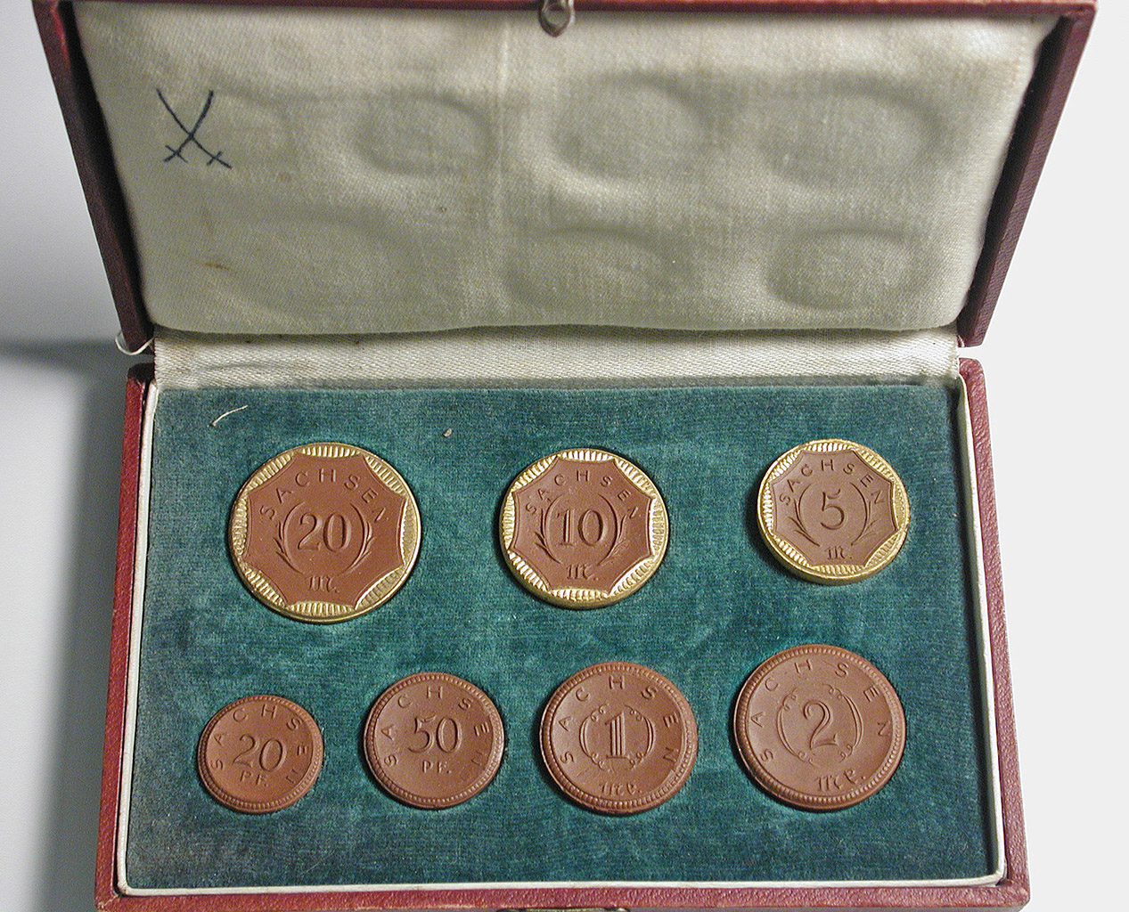 Left: "Proof" set of German porcelain notgeld. Center: Euro coin set from Ireland. Right: Thai coin set.