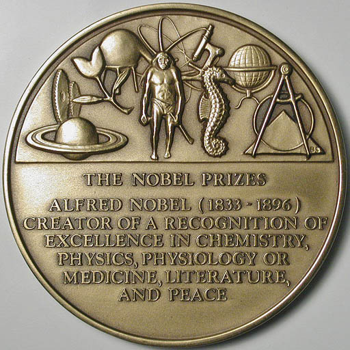 Right: Medal honoring Alfred Nobel and the Nobel Prizes.