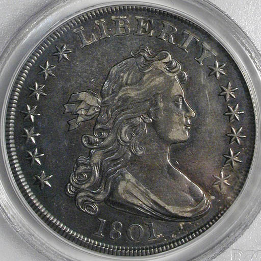 Left: 1801 Silver Dollar, PCGS AU-50. Right: 1853 with arrows dime.