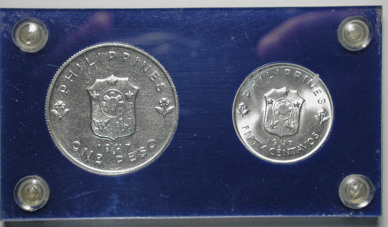 Top: 1936 Delaware Tercentenary commemorative half, NGC MS-65. Bottom: Set of 1947 Philippine coins depicting General Douglas MacArthur.