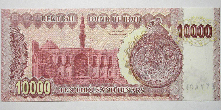 Top: Iraqi 10000 dinars banknote with serial number printing error,