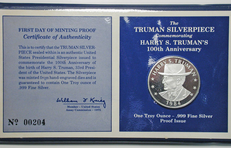 Left: 1984 Harry S. Truman 100th birth anniversary silver medal. Right: Set of brass medallions commemorating the first five U.S. Presidents.