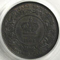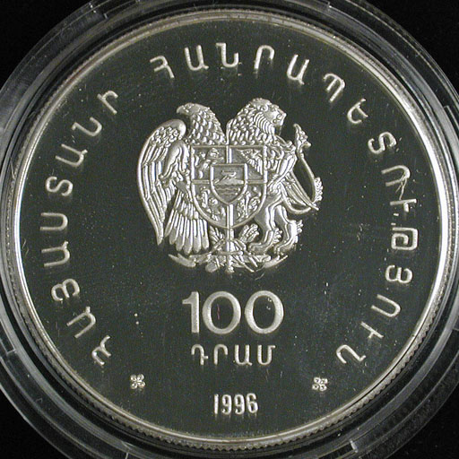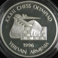 Left: 1864 Nova Scotia half cent, PCGS MS-63BN (Brown). Right: Armenian coin commemorating 1996 XXXII Chess Olympiad.