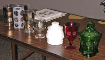 Left: Dick Cowley giving talk about coin glass. Center: Samples of coin glass. Right: A coin candle!