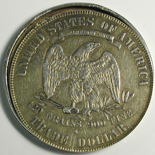 Left: U.S. and British Trade Dollars. Right: Case made from 1876-S U.S. Trade Dollar.