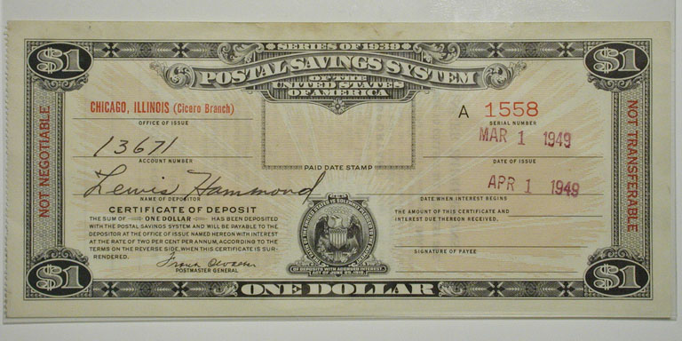 Top: Postal Savings System $1 Certificate of Deposit dated 1949.