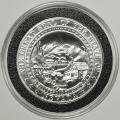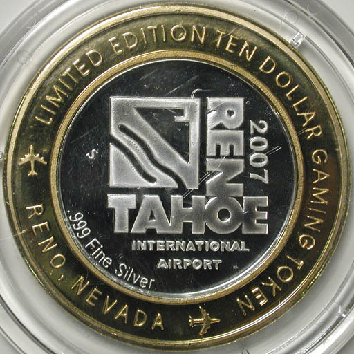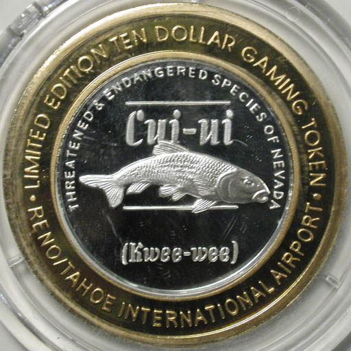 Left: 2005 "Wendover Will" commemorative silver piece from West Wendover, Nevada. Right: 2007 Reno-Tahoe International Airport $10 gaming token featuring the cui-ui (kwee-wee).