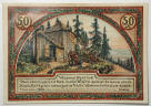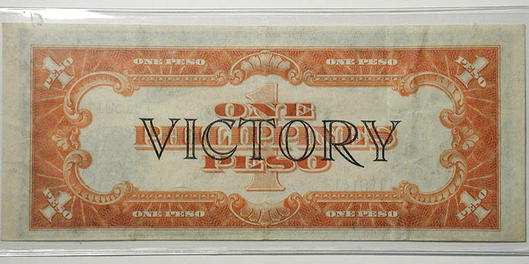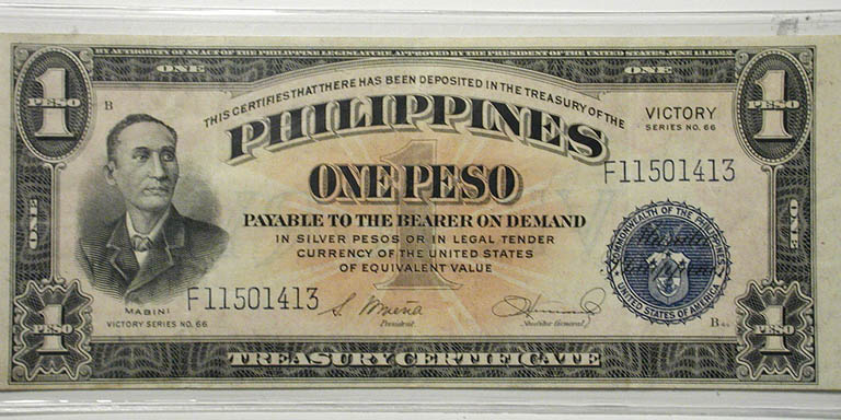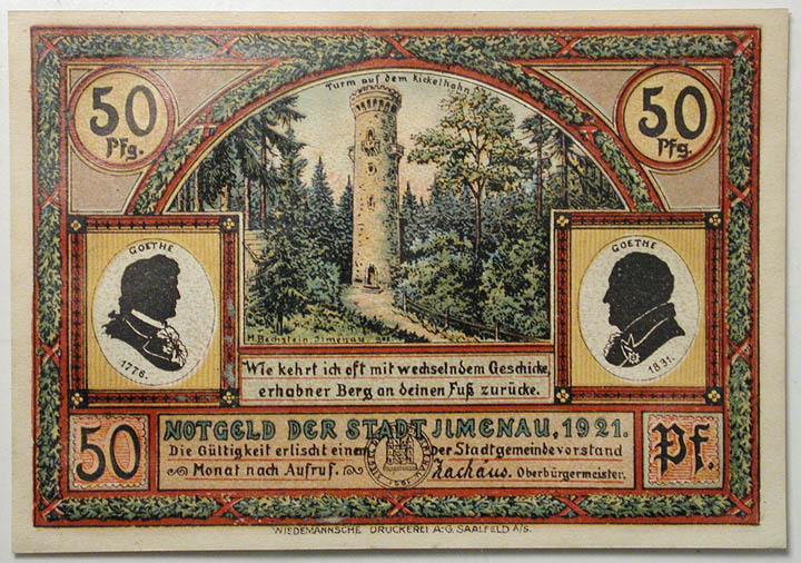 Top: 1921 50 pfennig German notgeld depicting Goethe. Bottom: Philippines One Peso banknote, Victory Series No. 66, approved 1922.