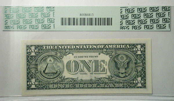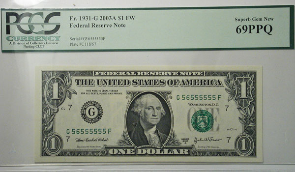 Right: Serial Number G56555555F 2003-A $1 Federal Reserve Note, PCGS Superb Gem New 69PPQ.