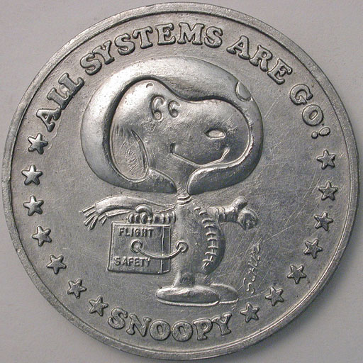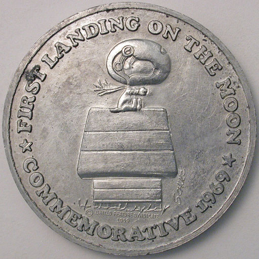 Left: 1969 Snoopy First Landing on the Moon commemorative medallion. Right: Olympia Coin Club 50th anniversary medal (1958-2008).