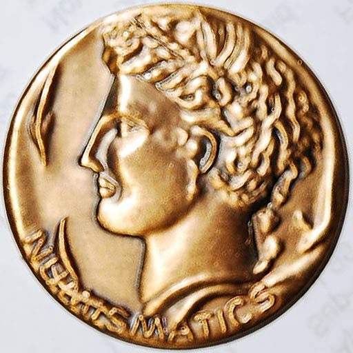 Left: "Numismatics" medal in the style of an ancient Greek coin.