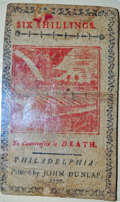 Left: 1777 Six Shillings colonial currency, printed in Philadelphia by John Dunlap. Right: 1845 Liberty Seated Dollar, PCGS PR63, J.A. Stack collection.