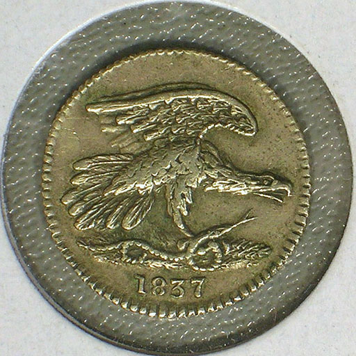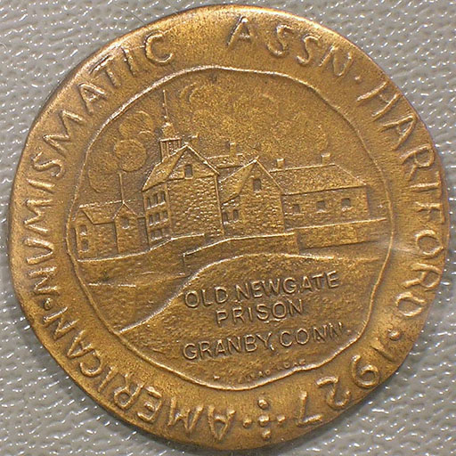 Left: 1837 Feuchtwanger Cent pattern. Right: Medal issued for 1927 ANA convention in Hartford.