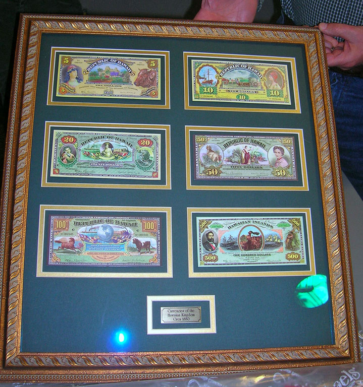 Left: c. 1880 currencies of the Republic of Hawaii. Center/Right: 2008 U.S. Mint Bald Eagle commemorative one dollar coin.