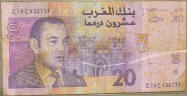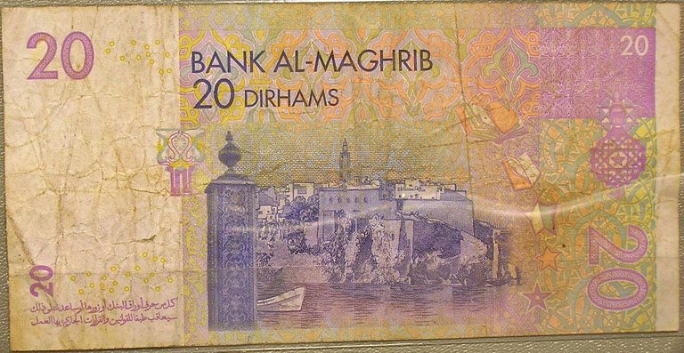 Top: Official "souvenir token" for Expo '74 World's Fair in Spokane. Bottom: Bank of Al-Maghrib 20 dirhams banknote.