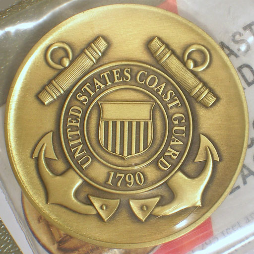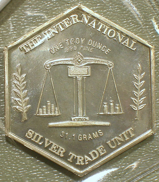 Left: United States Coast Guard Eagle commemorative medal. Right: Hexagonal one ounce "silver trade unit" featuring eagle and Liberty Bell.