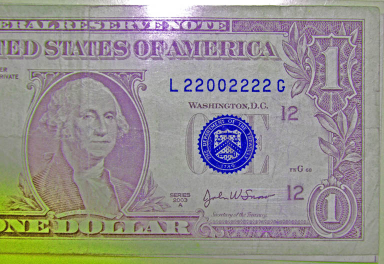 Right: Series 2003A $1 bill with blue serial number and Treasury seal.