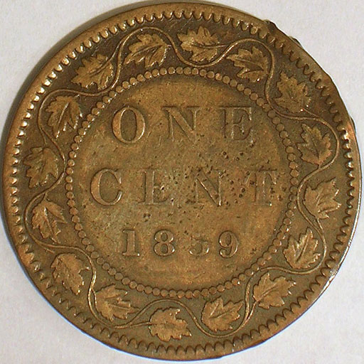 Upper Right: 1859, 9 over 8, Wide 9, bronze Canadian Large Cent.