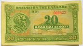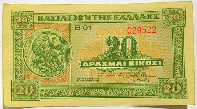 Upper: 1940 Greek 20 drachma banknote (Parthenon on back).