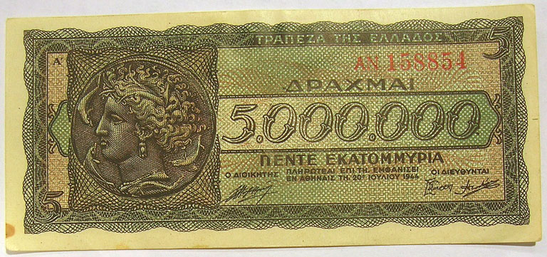 Middle: 1944 Greek 5,000,000 drachma inflation banknote.