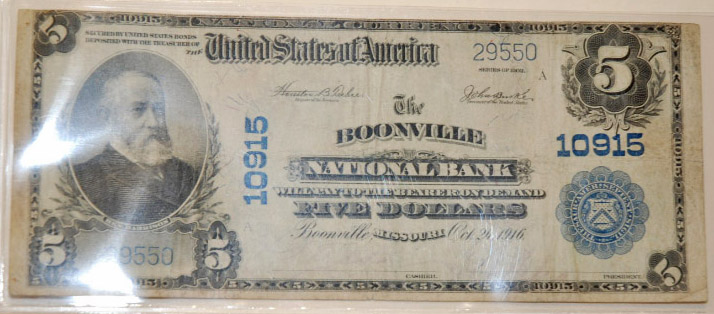 Left center: 1916 $5 Boonville, Missouri National Bank Note.