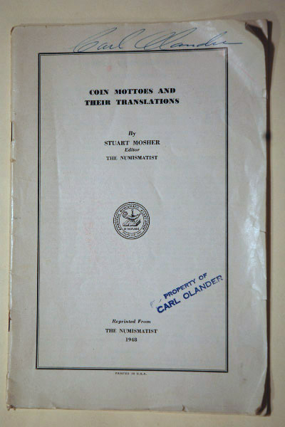 Left: Pamphlet on "Coin Mottoes and Their Translations," reprinted from 1948