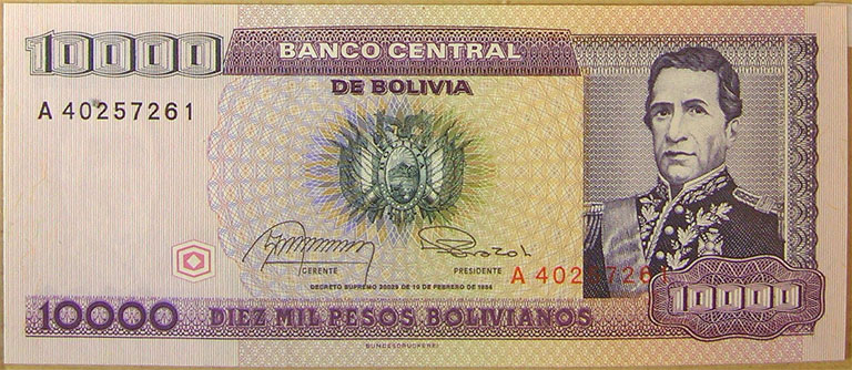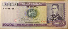 Top: Bolivia 10,000 pesos (Pesos Bolivianos) banknote.
