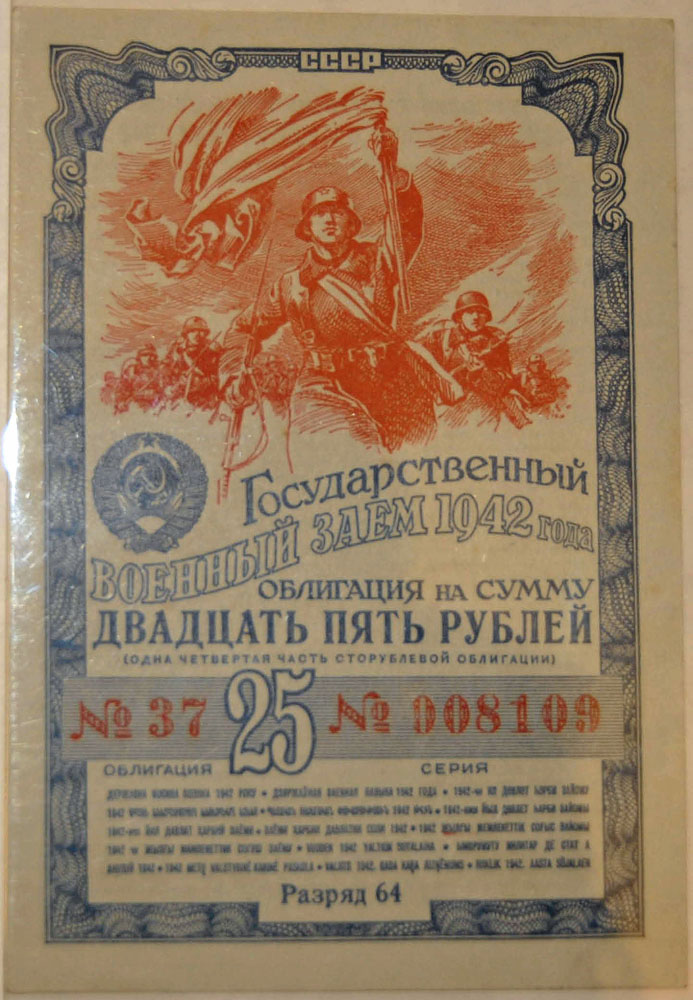 Left: 1942 and 1944 Soviet Union war bonds or similar items.