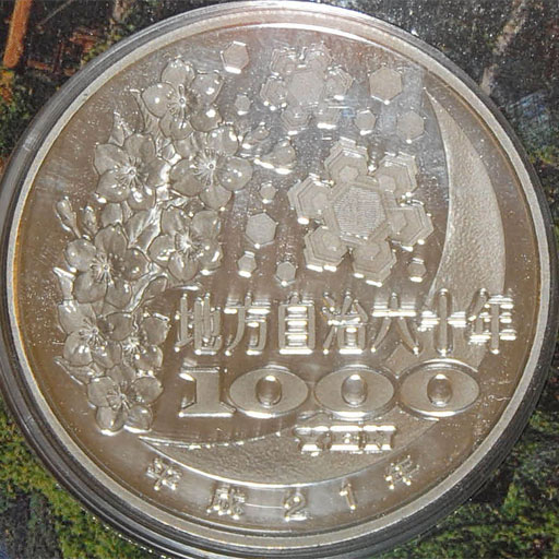 Left: Japan 1000 yen commemorative coin – anniversary of local autonomy law, Nagano.