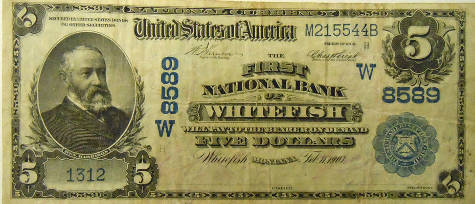 Bottom: 1902 National Bank of Whitefish, Montana $5 banknote.