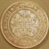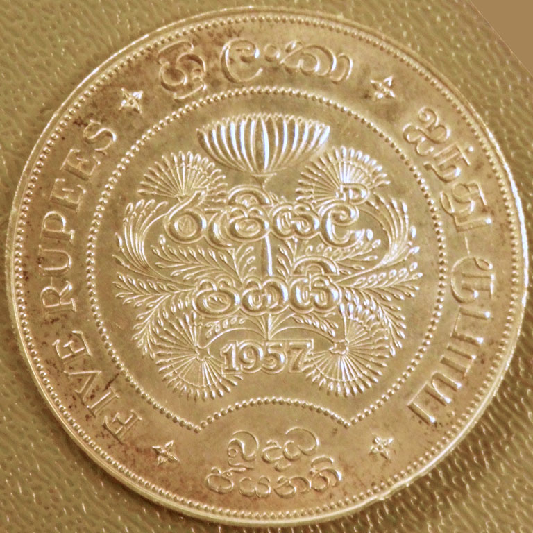 Center: 1957 Ceylon 5 rupees commemorative coin, 2,500 years of Buddhism.