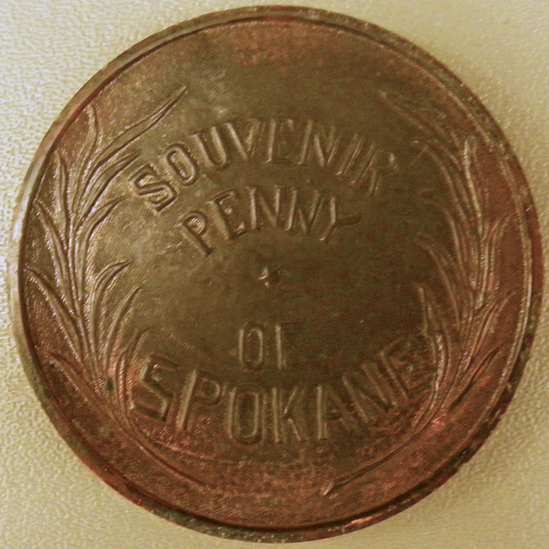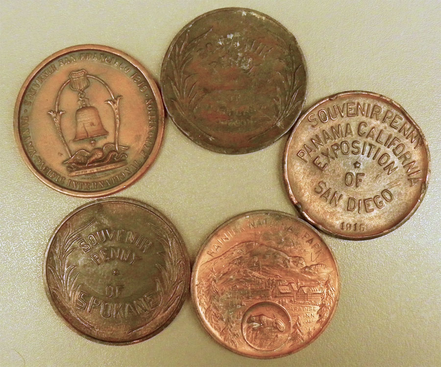 Lucky or Souvenir "Pennies" of various designs including 1915 Panama-California Expo and Mt. Rainier.