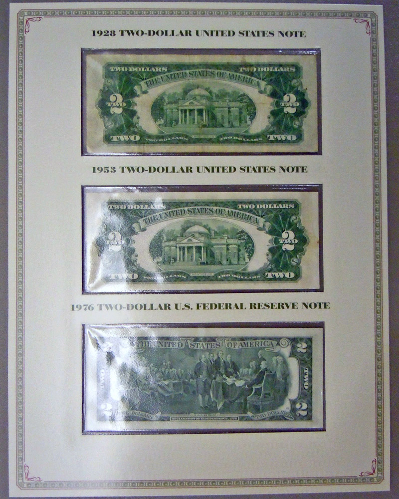 Left/Center: Two-Dollar Notes Folio: Series of 1928, 1953 and 1976.