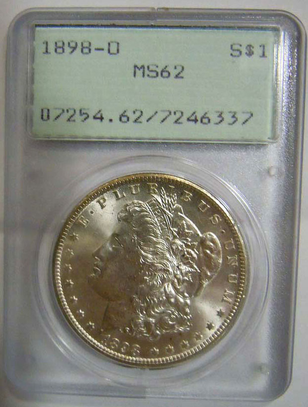 Left Center: 1898-O Morgan Dollar, PCGS MS62 (old holder).
