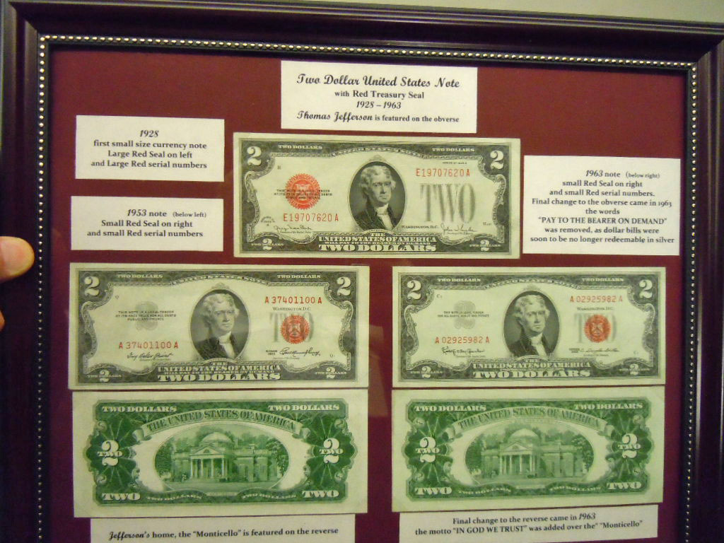 Left: Two Dollar United States Notes with red Treasury seal, 1928-1963.
