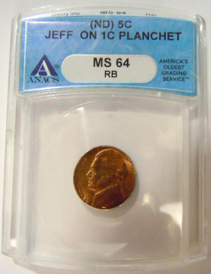 Center: Error coin, Jefferson nickel struck on cent planchet, certified by ANACS.