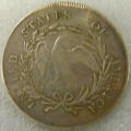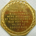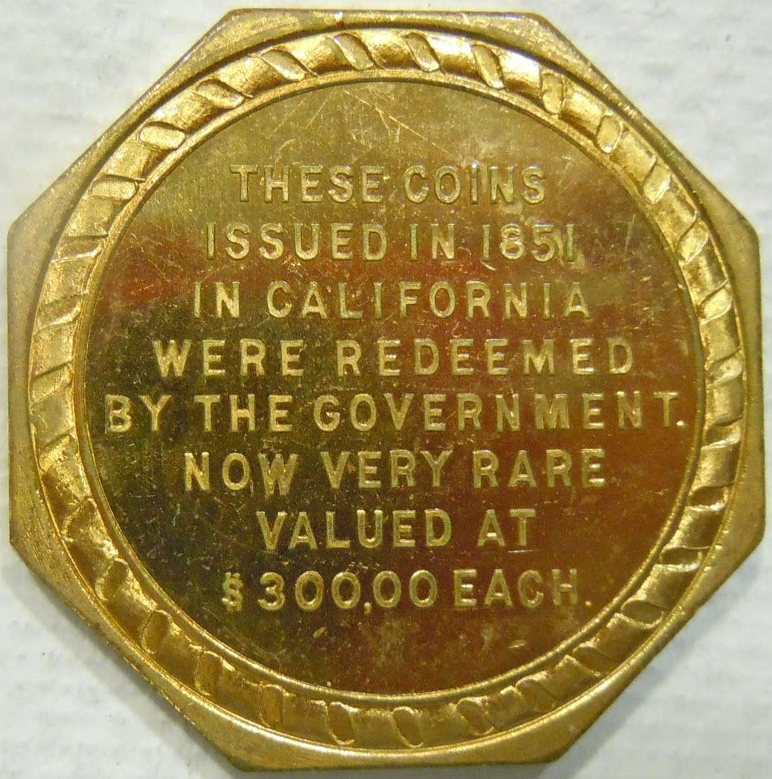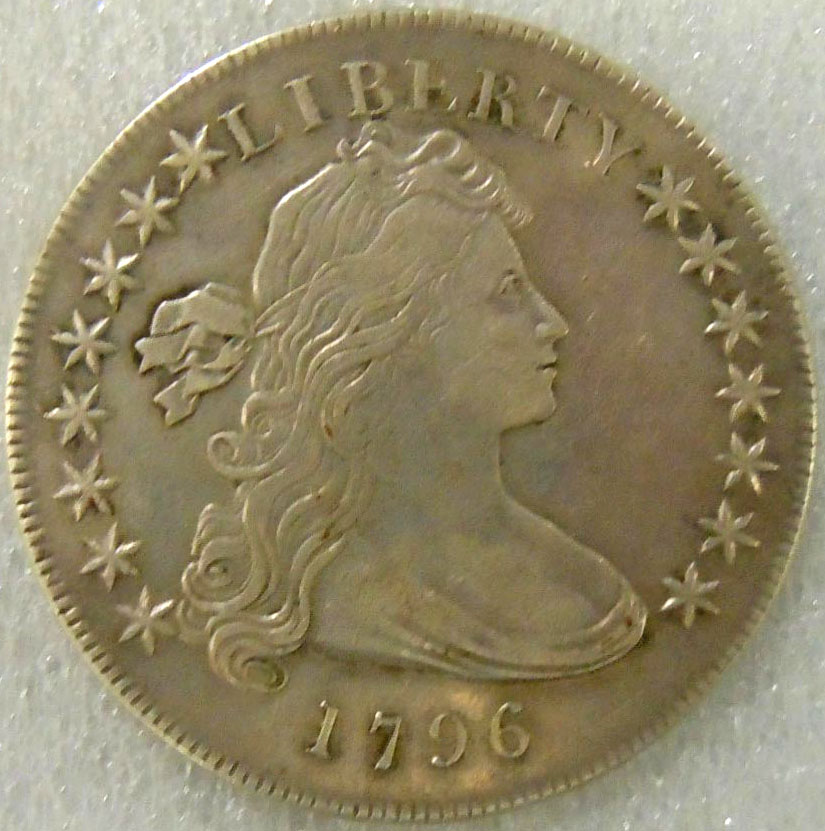 Left: 1796 Silver Dollar, PCGS Questionable (not slabbed). Right: 1906 Thompson Restaurants souvenir resembling 1851 $50 gold piece.