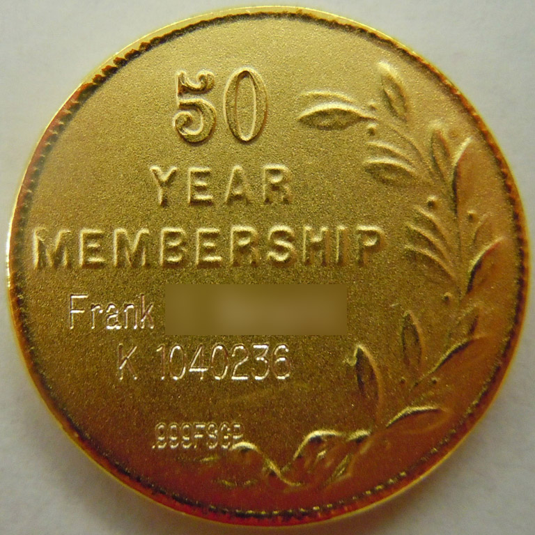 Frank B. and his ANA 40-year membership pin and 50-year membership medal (last name blurred).