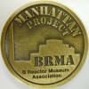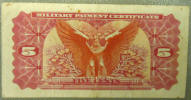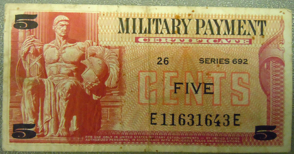 Left: Series 692 5 cents Military Payment Certificate. Right: B Reactor Museum Association (Hanford, Washington) medal.