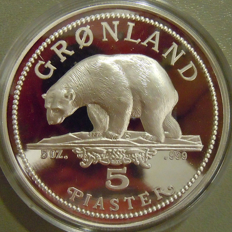 Right: 1987 Greenland 5 piaster 5-ounce silver coin depicting a polar bear.