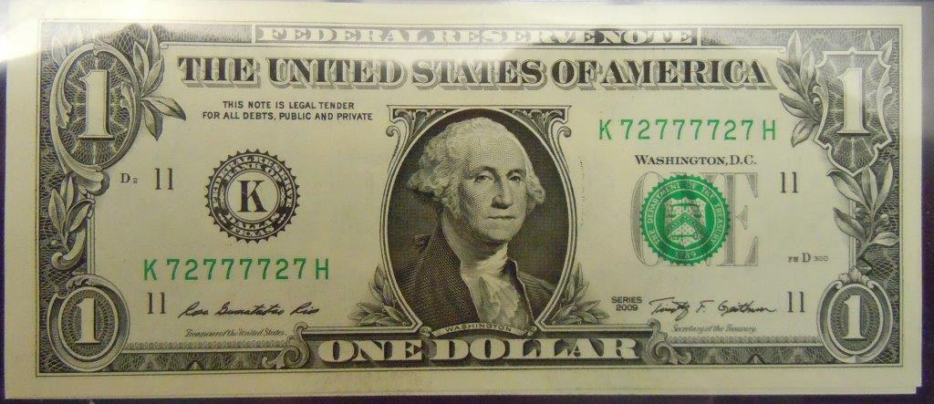 Top: 1922 $20 U.S. Gold Certificate. Bottom: 2009 $1 bill with palindrome serial number; also with six sevens!