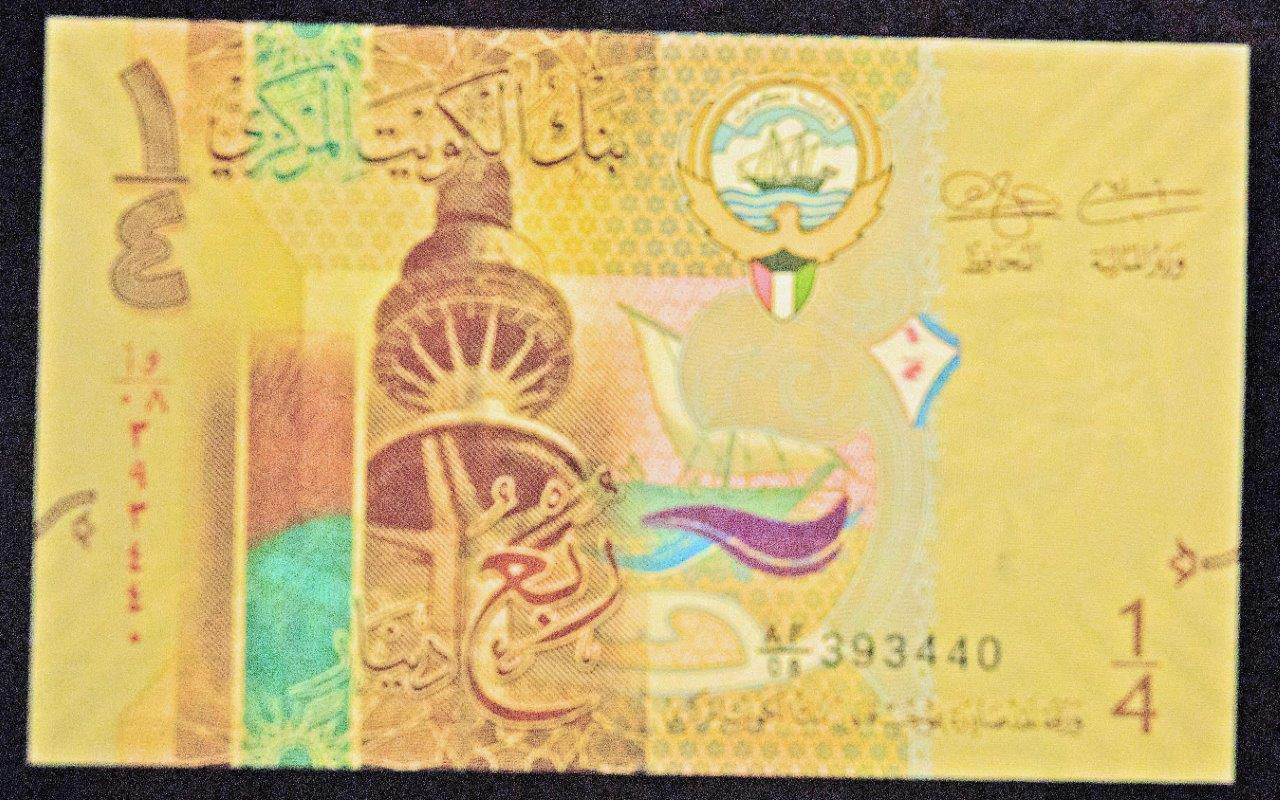 Top: Kuwait 1/4 Dinar banknote. Bottom: Kuwait 5 Dinars banknote.