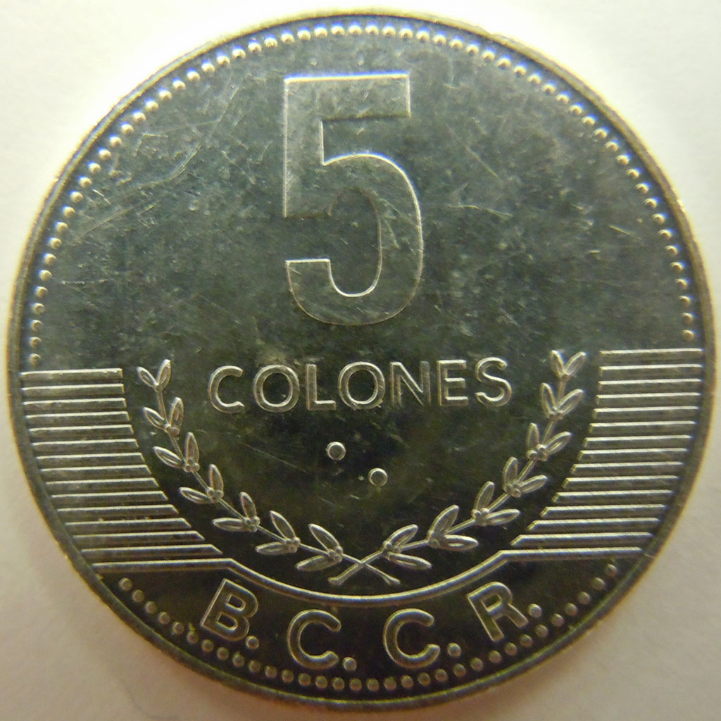 Left: 2008 Costa Rica 5 colones coin.
