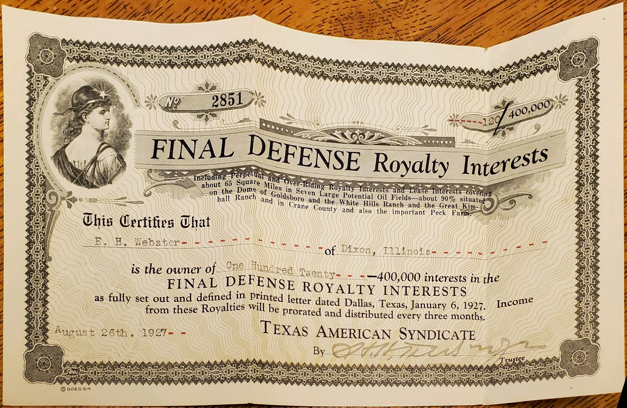 Right: Final Defense Royalty Interests certificate, Texas American Syndicate, dated August 26, 1927,