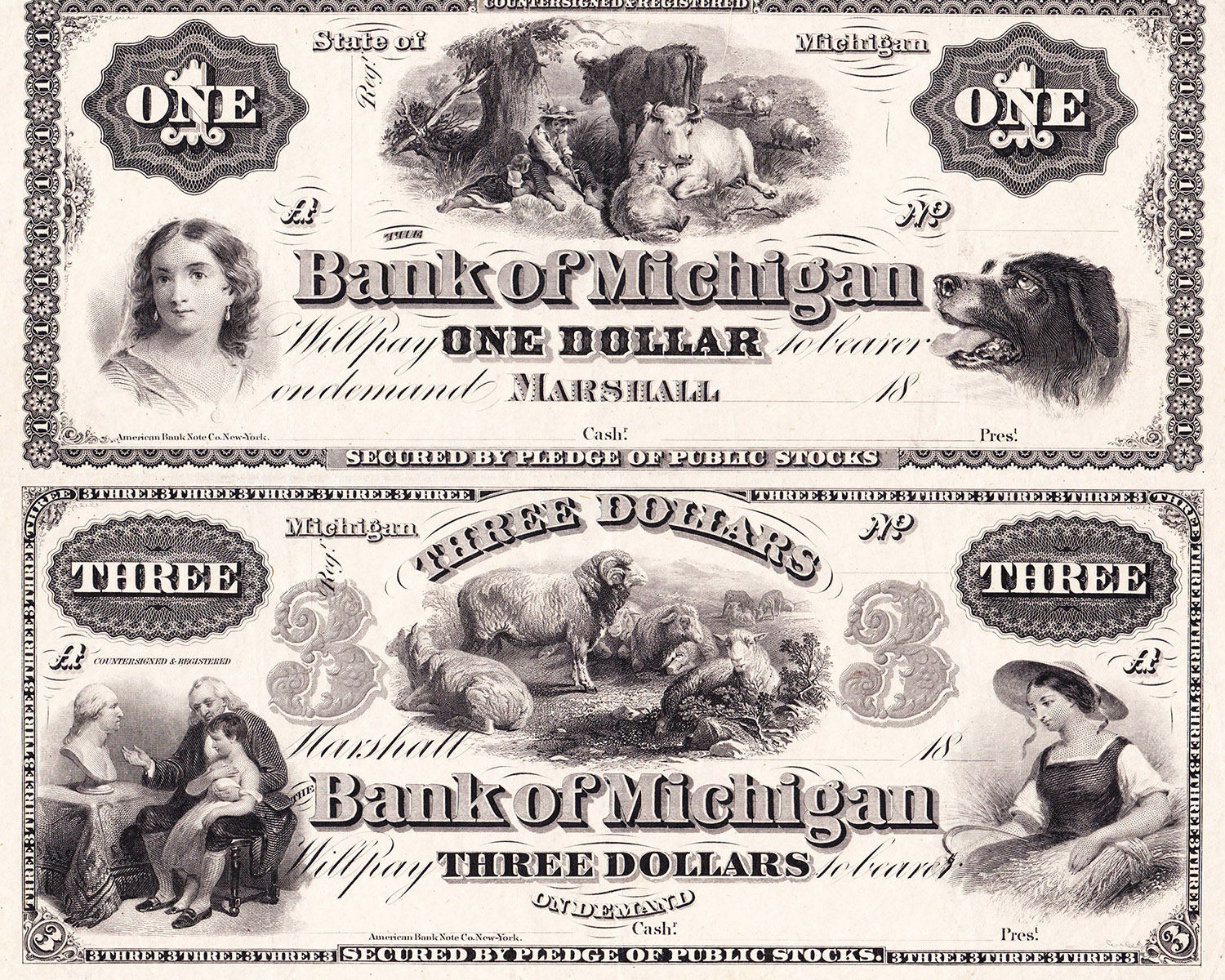 Bank of Michigan $1 and $3 banknotes from the 1800s. These were reportedly once owned