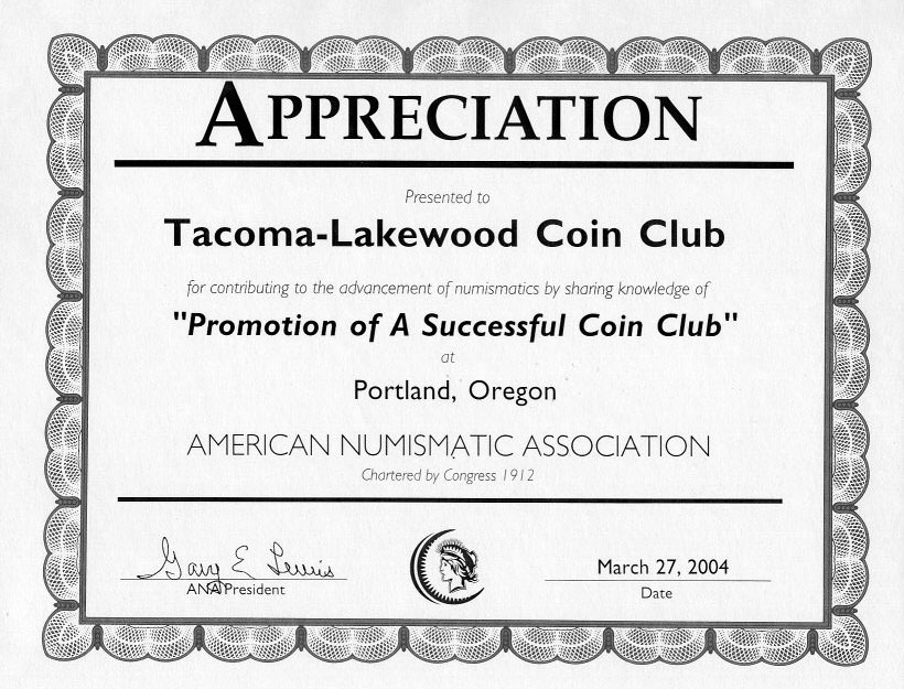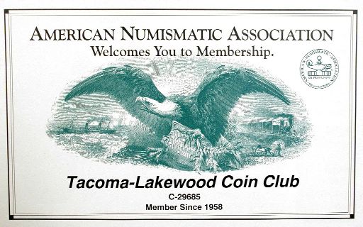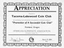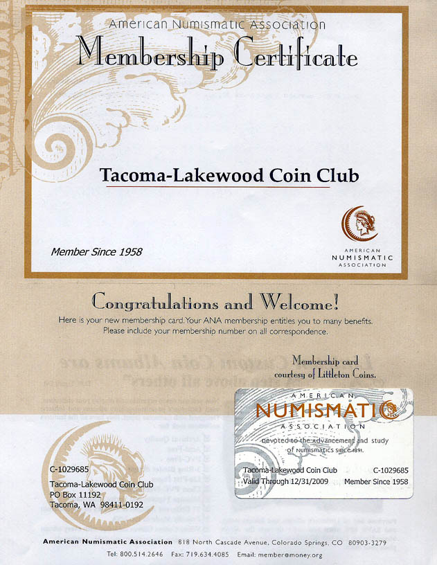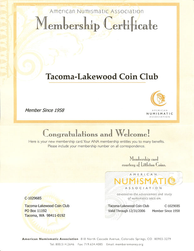 | ANA membership cards/certificates from the current Tacoma-Lakewood Coin Club are numbered Cyy-1. Other ANA certificates (such as the appreciation certificate shown) are numbered Cyy-2. | |||