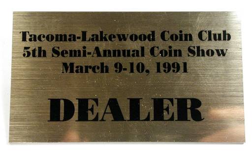 Tacoma-Lakewood Coin Club Show badge (2 x 3.5 inches, gold with black